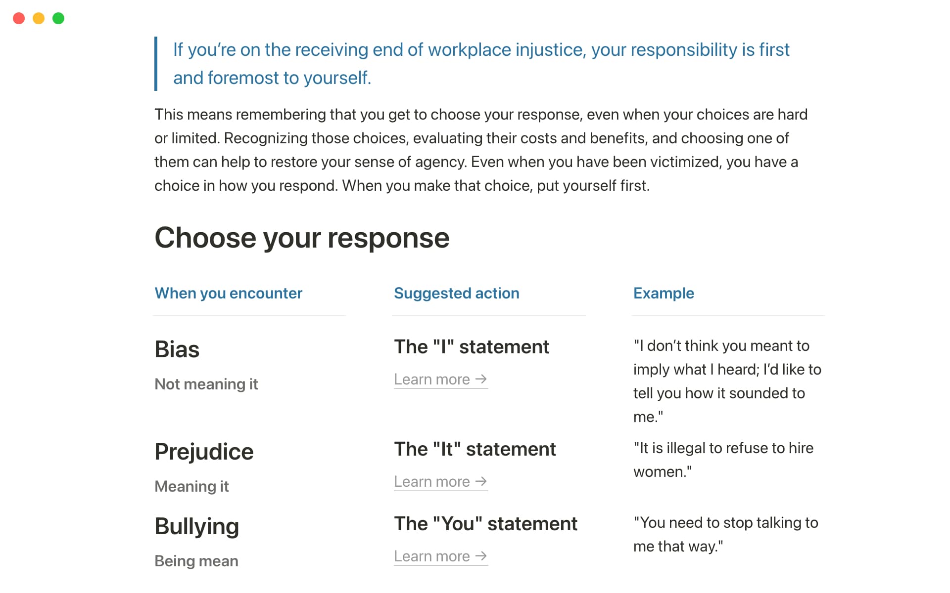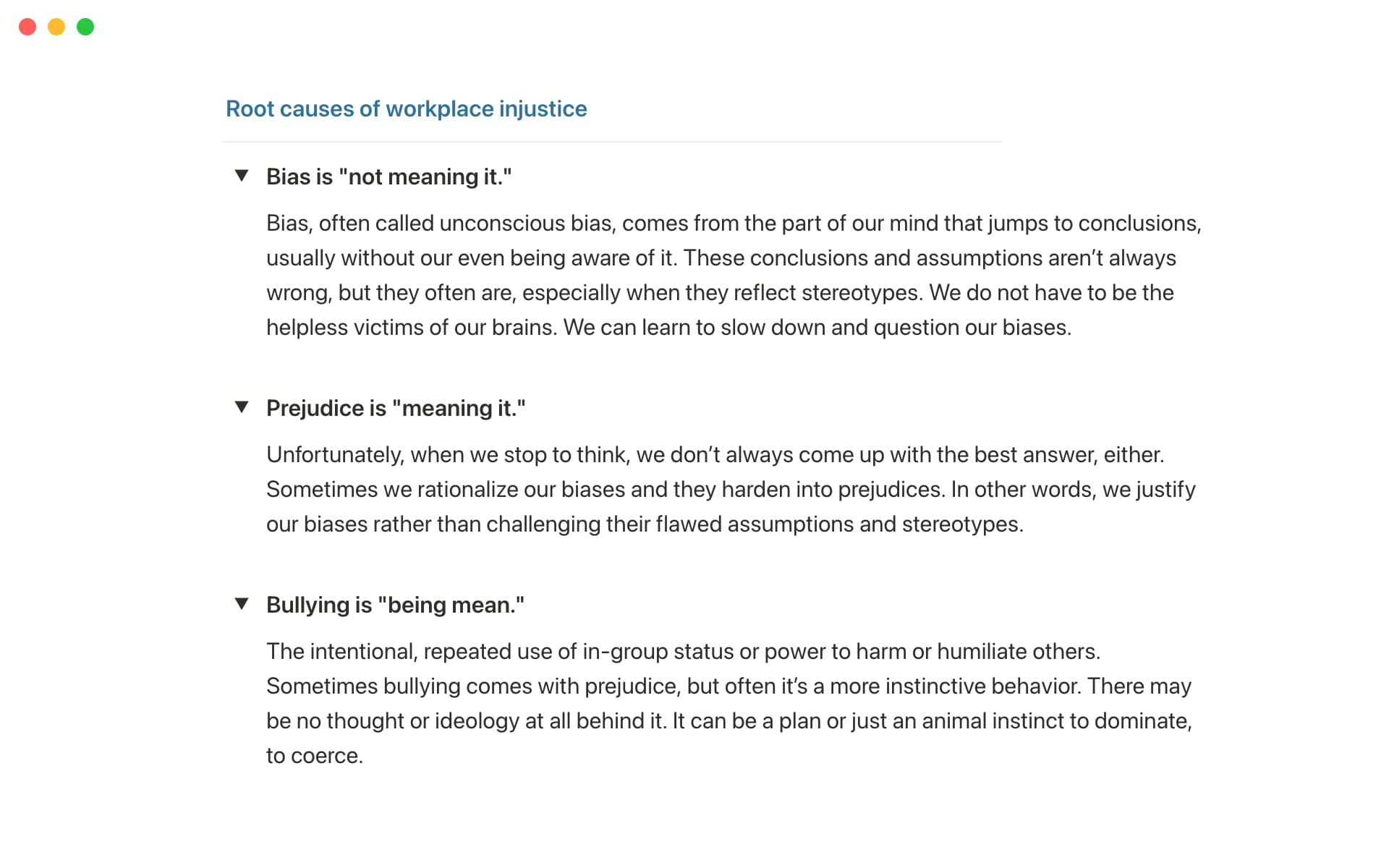 Injustices in the workplace are often labeled as just one thing: bias. But it's more complicated than that — the template includes Kim's breakdown of injustices into bias (not meaning it), prejudice (meaning it), and bullying (being mean) so you can more effectively respond to each situation.