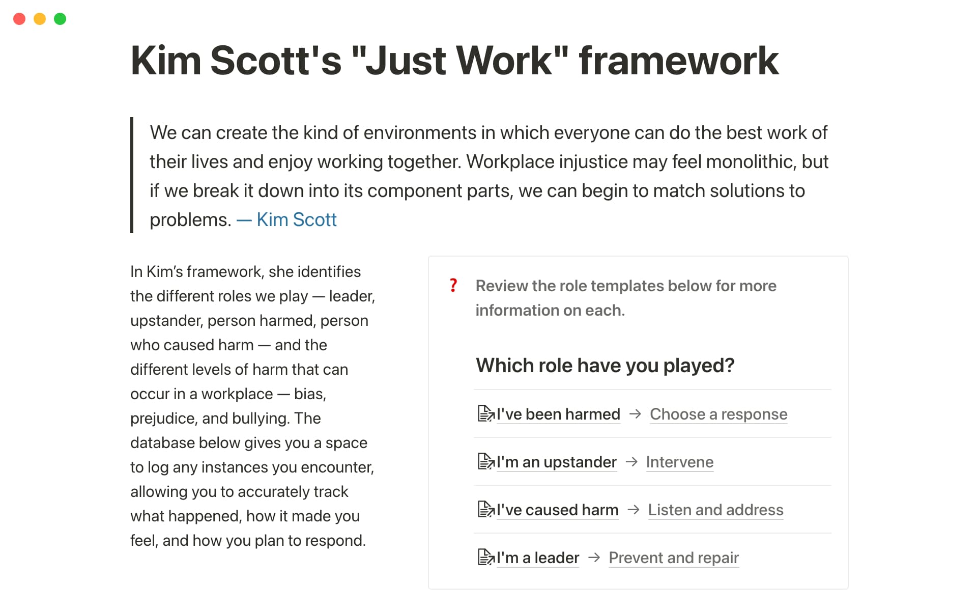 Bestselling author Kim Scott, who's helped hundreds of teams communicate better through Radical Candor, has partnered with veteran Chief People Officer Trier Bryant to tackle these injustices with their new Just Work framework. Put it into practice with her Notion template, which includes practical steps to log any injustices you encounter, identify your role, plan your response, and push your team toward a fair outcome.